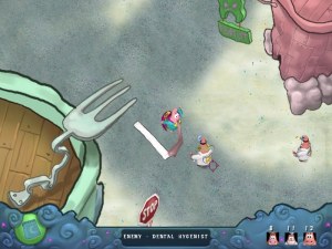 Как Губка Боб, вы участвуете в гонке на хот-роде, пытаясь выиграть Bikom Bottom Speedway Open. Управление - это простой щелчок мышью: щелчок левой кнопкой мыши для ускорения или использования пузырьков для атаки и щелчок правой кнопкой мыши для отображения больших кругов, которые по существу показывают ограниченные зоны столкновения. Если ваш круг переходит в другой, вы потерпите крах.